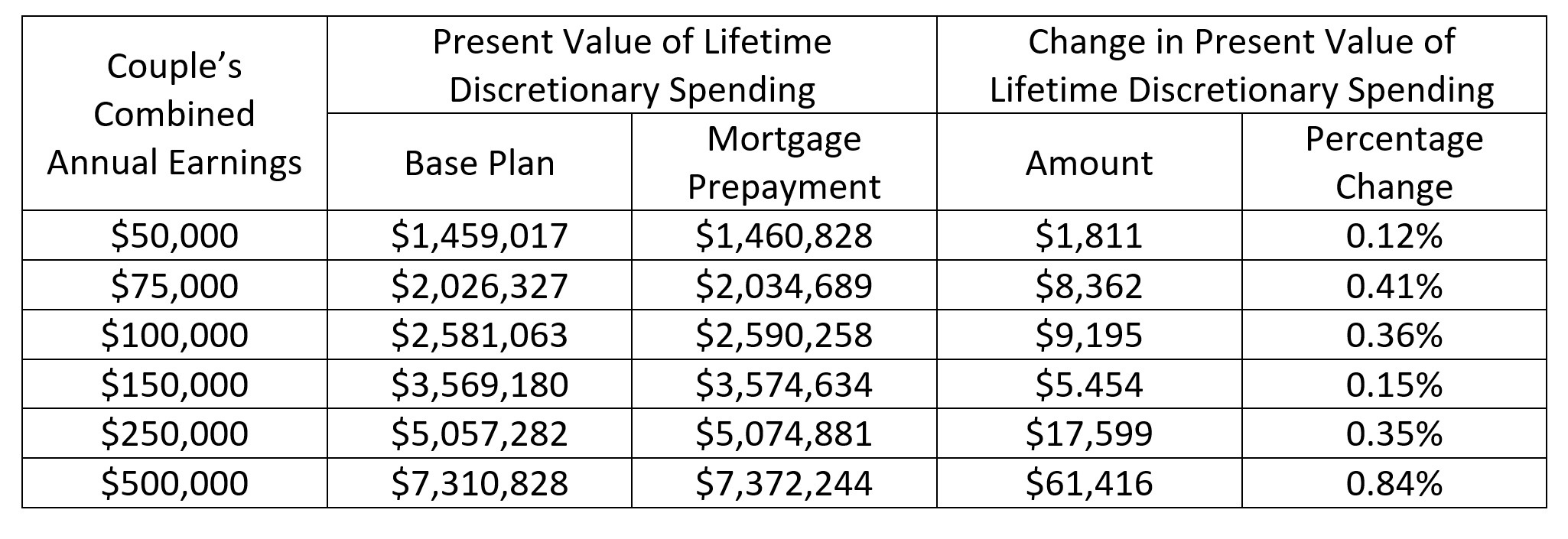 Row 3 of the table below shows the impact on the present value of Hannah and Connor’s lifetime discretionary spending of using the 401(k) contributions to pre-pay their mortgage. The other rows consider what would happen were Hannah and Connor to earn less or more and were all their other MaxiFi inputs scaled relative to row 3 based on their earnings. The bottom line for Hannah and Connor as well as for their poorer and richer versions is that they gain from pre-paying their mortgages even if they need to cut back on their retirement account contributions to make that happen. Indeed, for most couples, the lifetime discretionary spending gain is small, but not trivial.