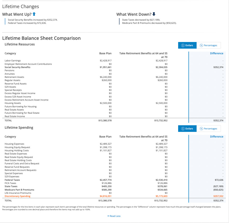 Please check out the last chart. It shows the present-value (PV) changes in the Jays’ lifetime balance sheets arising from this switcheroo. In PV, Social Security benefits rise by $352,374. On the other hand, the PV of federal taxes increases by $72,636. Interestingly, the couple pays $27,189 in PV in NY state income taxes. They also pay PV $50,625 less in Medicare Part B premiums (a tax in all respects except its name.)So the Jays have it wrong. Waiting till 75 is less tax efficient. The decline in state taxes and Medicare premiums exceeds the increase in federal income taxes.Can the Jays do even better by, say, taking Social Security at 70, but starting their IRA withdrawals at 66 rather than 64. The answer is yes and no. Doing so raises their lifetime spending by about $20K, but it reintroduces cash flow problems.Here’s my bottom line. If something makes Wall Street really happy, it’s not likely to make you really happy. If a couple as well-heeled as the Jays aren’t able to benefit from The Secure 2.0 Act’s increase in the RMD start age, waiting till 75 to start IRA withdrawals is not likely to be in your interest.