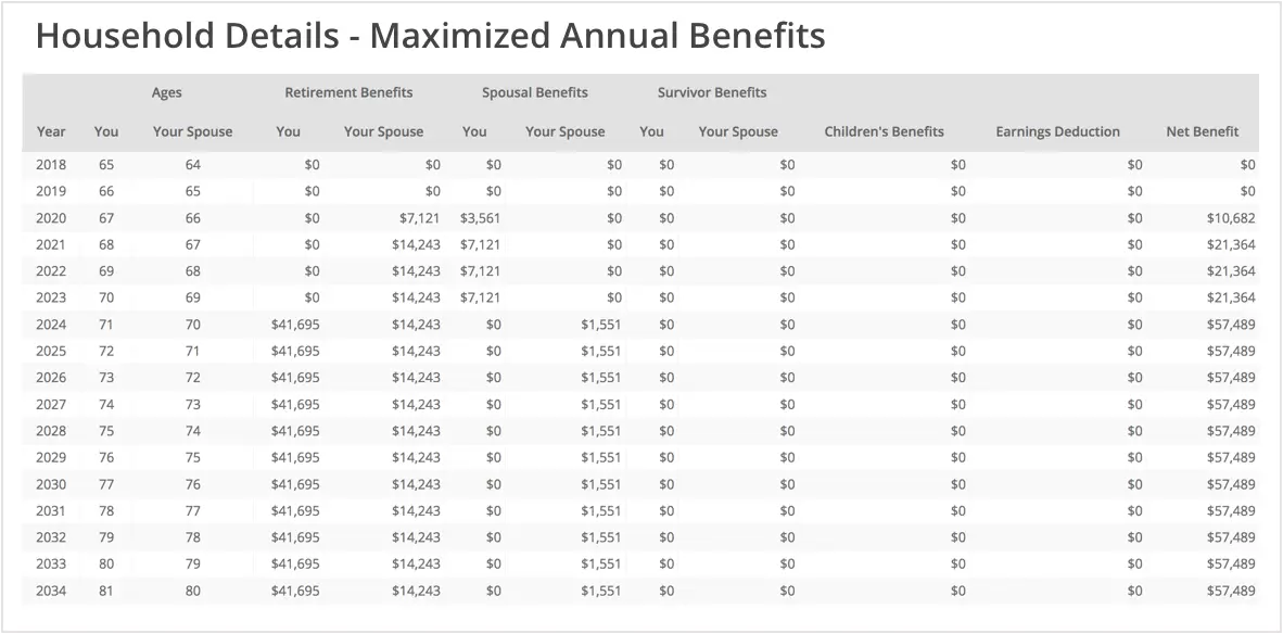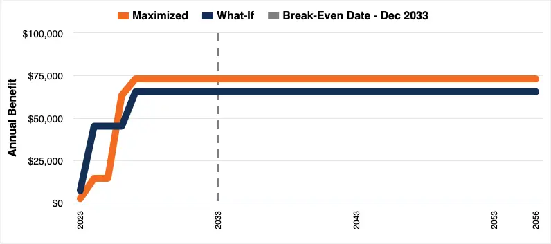 View important detail on benefit amounts received each year under both your “what-if” strategy and the Maximized Plan, including when your Maximized Plan benefits break even with your “what-if” benefits.